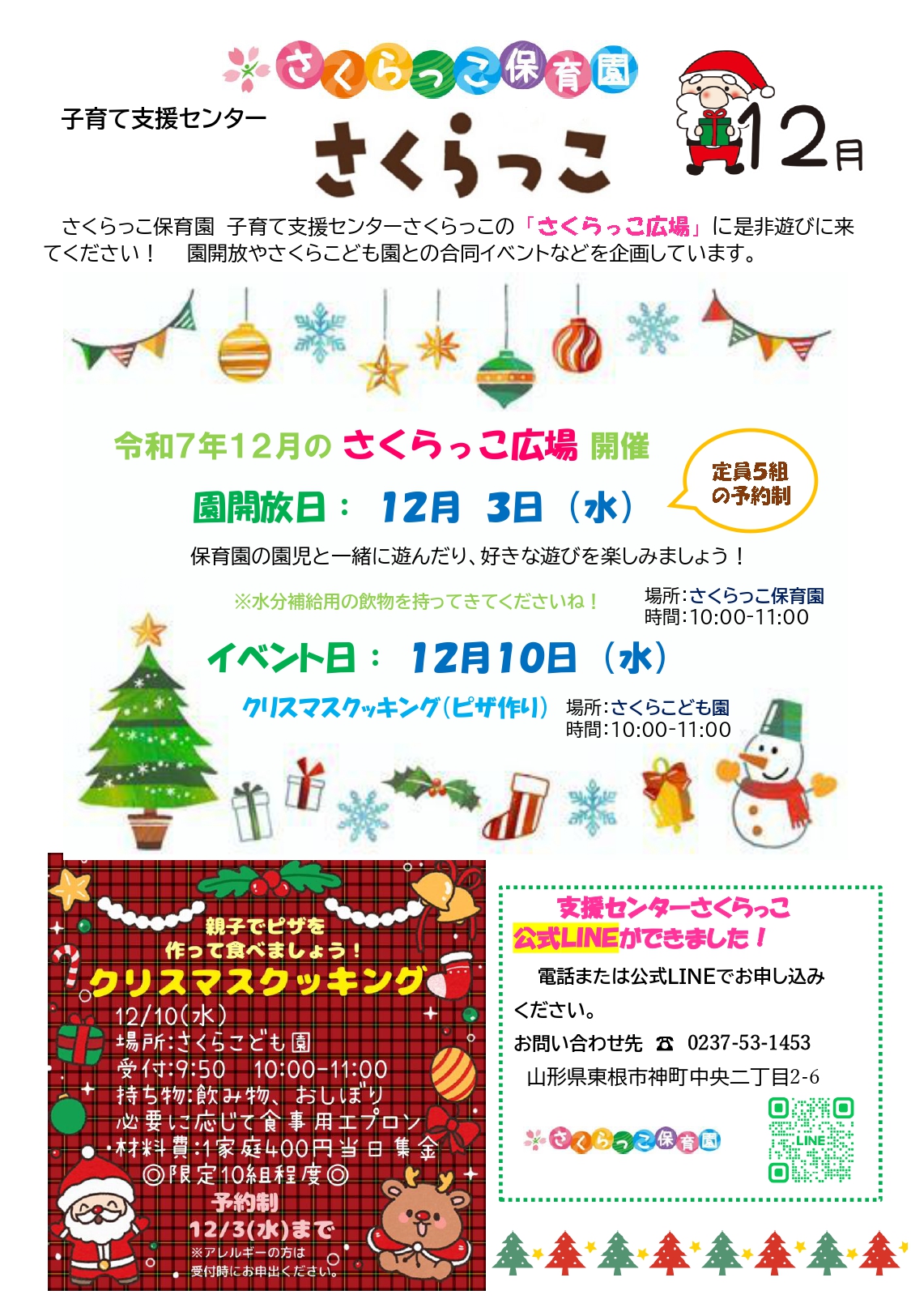 12月のさくらっこ広場のお知らせ 2025年11月20日 最終更新日時 : 2025年11月20日 さくらっこ保育園12月は以下の日程で地域交流事業「さくらっこ広場」を開催します。 【12月3日(水)】 10:00-11:00 場所:さくらっこ保育園 園開放日 ※定員5組の予約制です。 【12月10日(水)】 10:00-11:00 場所:さくらこども園イベント日 ※限定10組程度の予約制です。 お電話、公式LINEで予約受付致します。LINE ID「@747dclcm」で検索していただくことも可能です!
